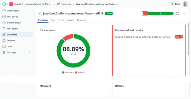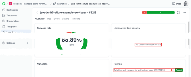 If the result of are-run becomes greenm (successfully passed), then such test result will be removed from the Unresolved test results section, the fact of re-run will be logged in Retries widget of the Launch's overview.