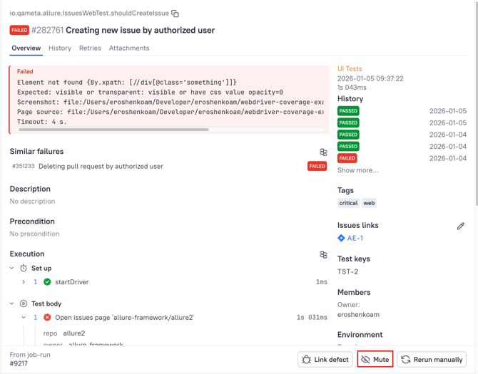 A Mute attribute allows you to ignore the failure (like a quarantine) in consecutive launches until you remove Mute from the linked test case. Mute hides the failure from the overview, marks the failure as resolved, and prevents the test result status from being used in statistics.