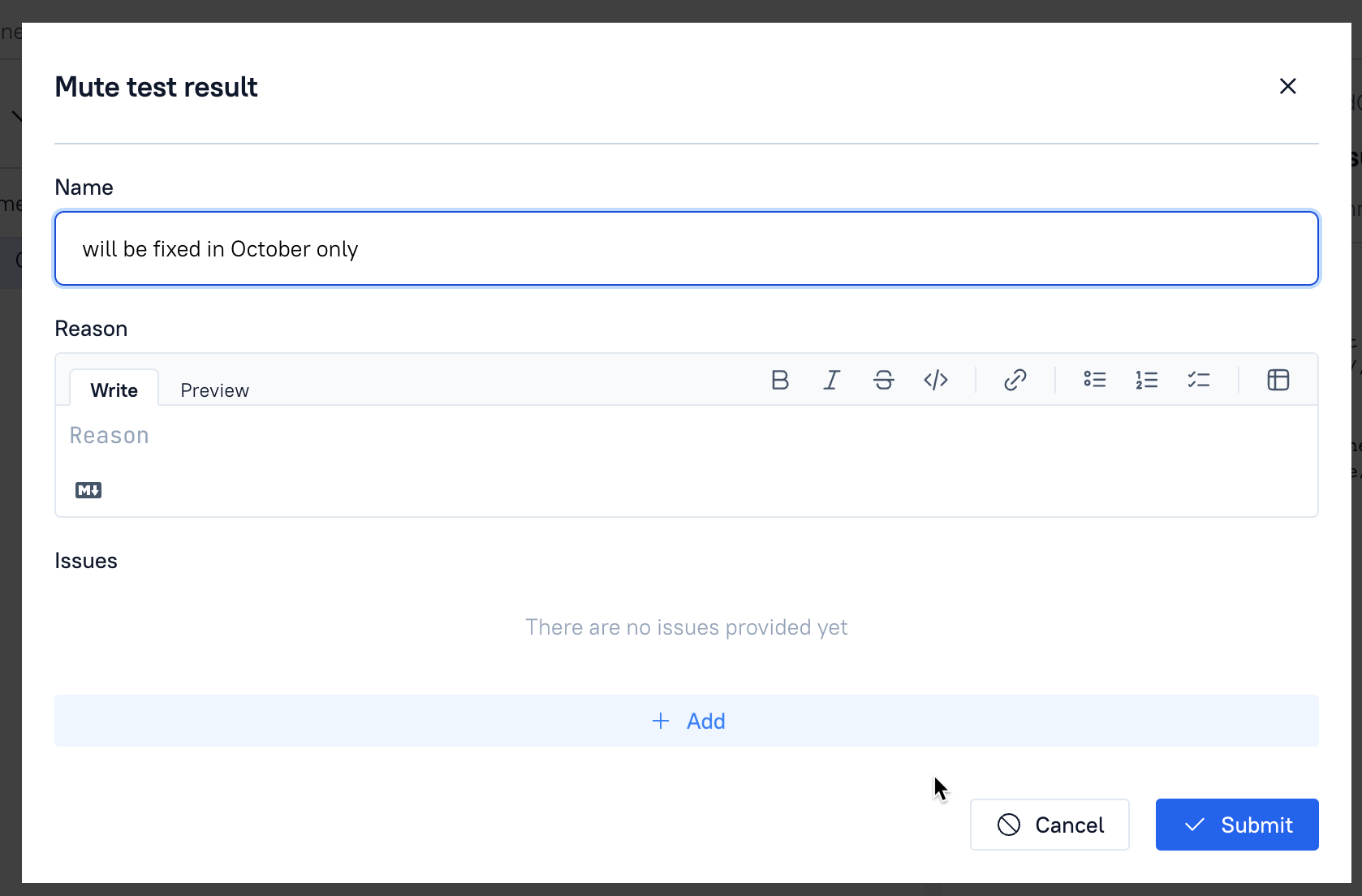 You canprovide the describption of the reason the test result (and related test case) was Muted.