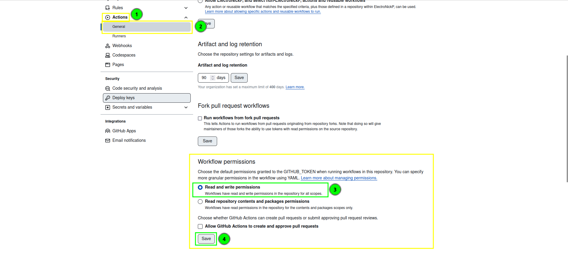 - Under "General," set the "Workflow permissions" to "Read and write permissions."